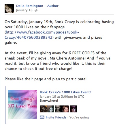- I’ve had great fun participating in the Book Crazy 1000 Likes celebration event. It’s been so successful, it’s continued on throughout the rest of this week, and I’ve still got two more copies of my book to give away. To participate, go to their events page. There are lots of other prizes as well.