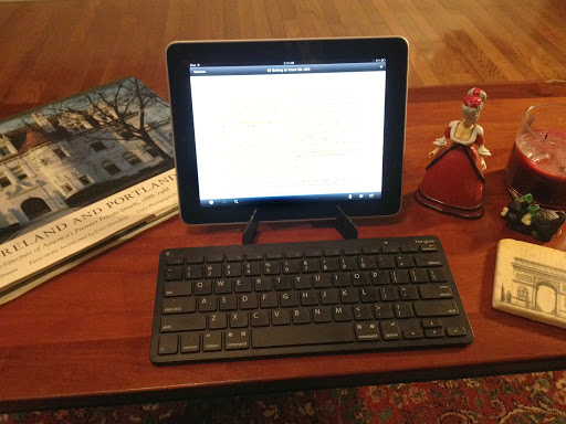 My iPad is often my favorite way to write. I can carry it anywhere (in this case, my living room), and with my wireless keyboard and the Notebooks app synched with Dropbox, I can easily upload and save files that I can then transfer to Scrivener on my desktop machine for formatting. I’ve written several chapters this way, and I absolutely love it.